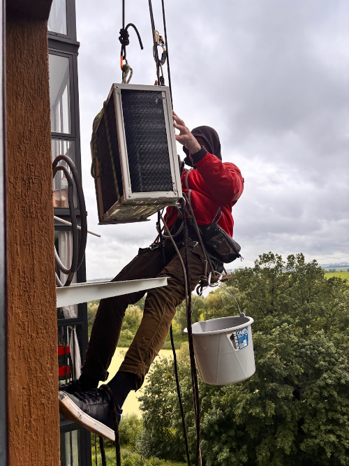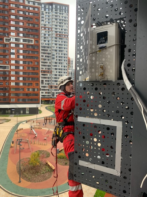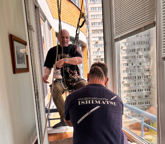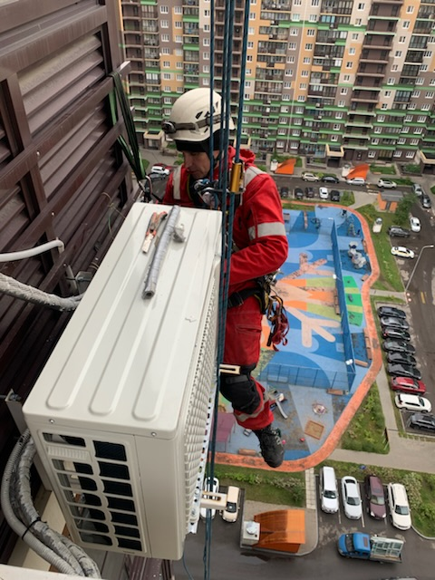 Когда нет возможности установить внешний блок стандартным способом – через окно или балкон, привлекают альпинистов. Услуга добавляется к общему перечню на этапе разработки схемы подключения кондиционера, поэтому решение принимается с учетом всех условий. Обычно альпинист работает на высоте, если до нужной точки монтажа невозможно добраться из окна. Альпинистское снаряжение решает этот вопрос, но куда важнее навыки, опыт и знания.