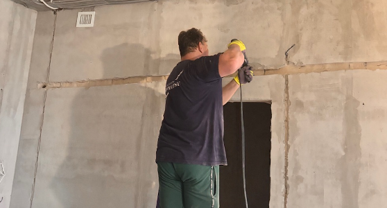 - Выполнение отверстий в стене, штробление. Необходимо создать условия для прокладки трассы между помещениями, а также для дальнейшего подведения к внутреннему блоку.